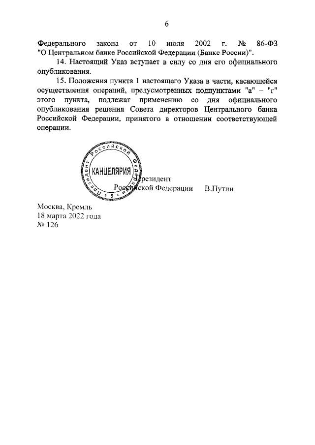 15. Положения пункта 1 настоящего Указа в части, касающейся осуществления операций, предусмотренных подпунктами «а» – «г» этого пункта, подлежат применению со дня официального опубликования решения Совета директоров Центрального банка Российской Федерации, принятого в отношении соответствующей операции.
