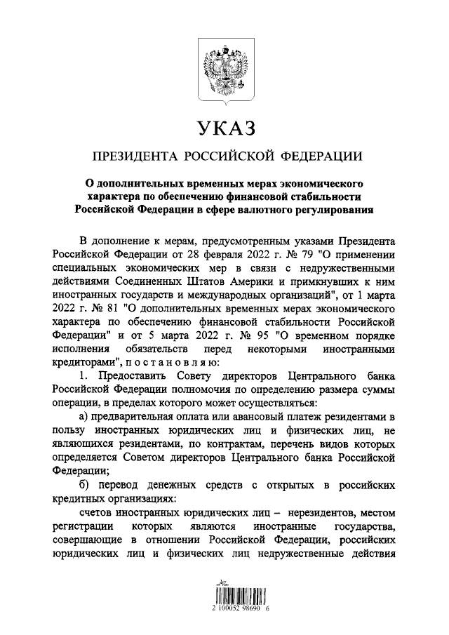 В дополнение к мерам, предусмотренным указами Президента Российской Федерации от 28 февраля 2022 г. № 79 «О применении специальных экономических мер в связи с недружественными действиями Соединенных Штатов Америки и примкнувших к ним иностранных государств и международных организаций», от 1 марта 2022 г. № 81 «О дополнительных временных мерах экономического характера по обеспечению финансовой стабильности Российской Федерации» и от 5 марта 2022 г. № 95 «О временном порядке исполнения обязательств перед некоторыми иностранными кредиторами», постановляю: