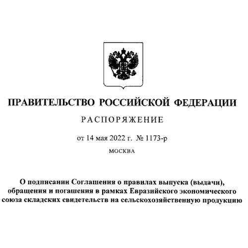 Правительство утвердило проект соглашения о правилах выпуска (выдачи), обращения и погашения в рамках Евразийского экономического союза складских свидетельств на сельскохозяйственную продукцию. Документ об этом подписал Председатель Правительства Михаил Мишустин. Распоряжение Правительства...