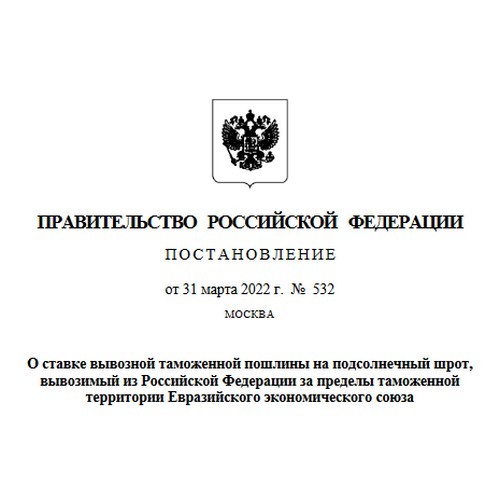 Михаил Мишустин подписал постановление о ставке вывозной таможенной пошлины на экспорт подсолнечного шрота. Она будут действовать с 1 мая по 31 августа 2022 года в отношении продукции, вывозимой из России за пределы Евразийского экономического союза. Экспорт подсолнечного шрота будет облагаться...