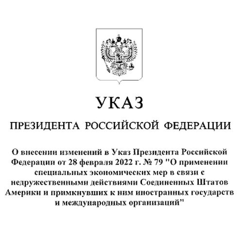 Глава государства Владимир Путин подписал Указ «О внесении изменений в Указ Президента Российской Федерации от 28 февраля 2022 г. № 79 «О применении специальных экономических мер в связи с недружественными действиями Соединенных Штатов Америки...
