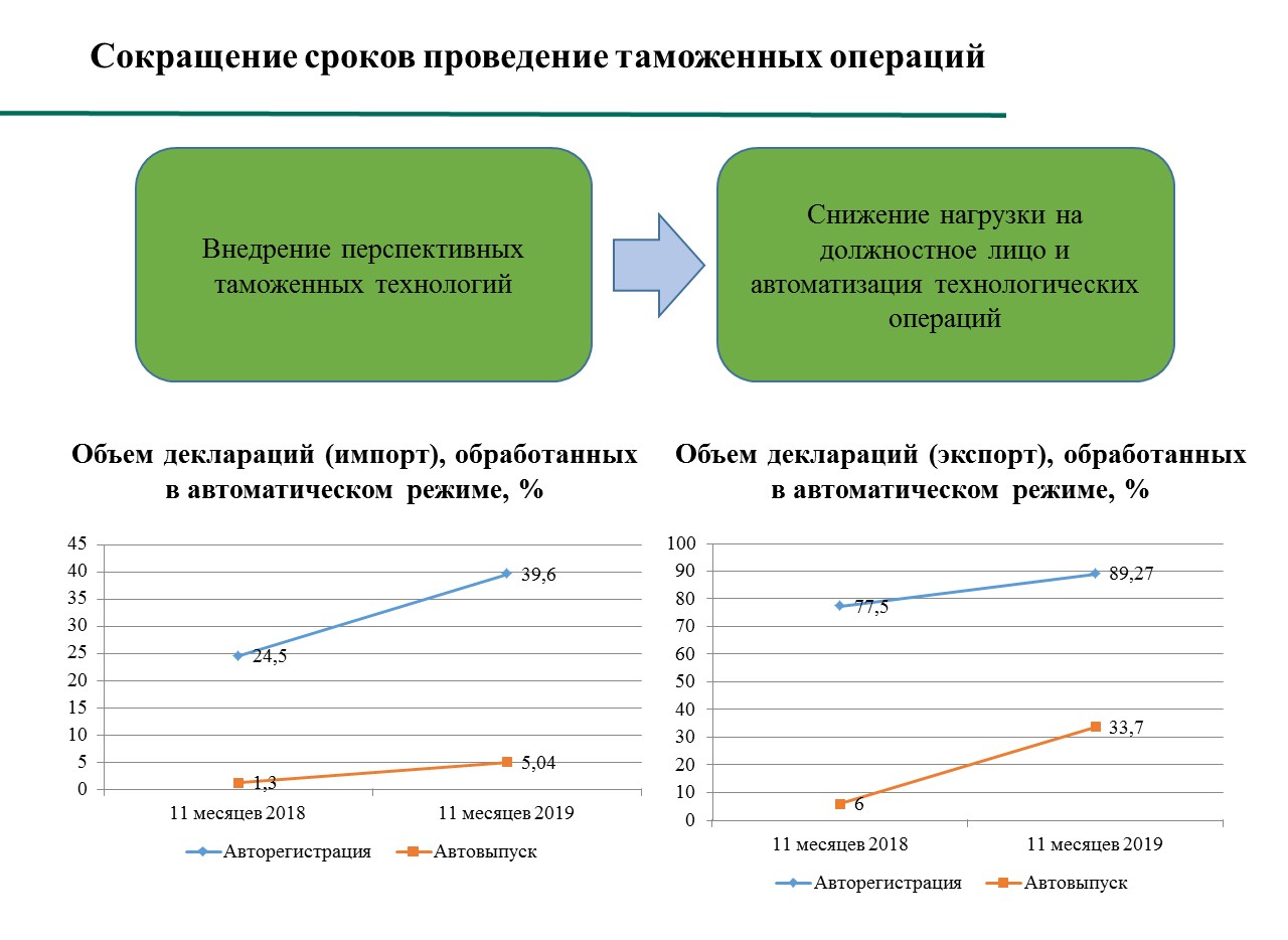 Для сокращения сроков проведения таможенных операций широко используется внедрение перспективных таможенных технологий, позволяющих снизить нагрузку на должностное лицо и автоматизировать технологические операции. Приоритетным направлением для таможенных органов остается работа по увеличению доли автоматической регистрации деклараций на товары и автоматического выпуска.