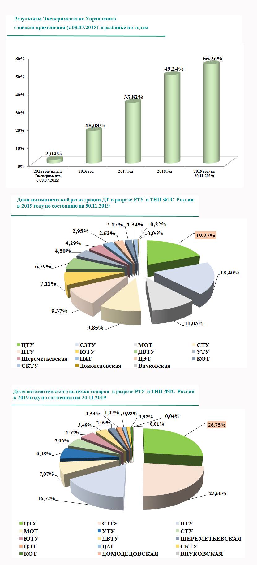 На базе 6 таможен Управления проводится эксперимент по концентрации декларирования в ЦЭД с одновременным ограничением принятия деклараций на товары таможенными постами фактического контроля. В рамках эксперимента ЦЭДами в настоящее время выпускается более 55 % декларационного массива Управления - 438 146 деклараций на товары (ДТ). Для сравнения, в 2015 году, в начале проведения эксперимента, эта доля составляла 2%. При этом в рамках таможенных органов, участвующих в эксперименте, ЦЭДами выпускается более 95% ДТ.