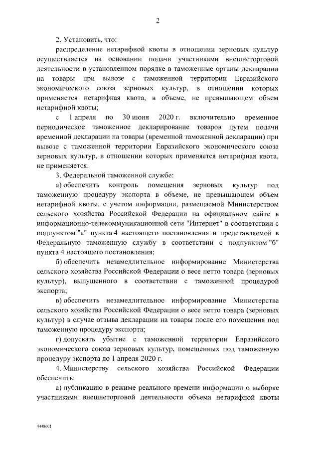 а) обеспечить контроль помещения зерновых культур под таможенную процедуру экспорта в объеме, не превышающем объем нетарифной квоты, с учетом информации, размещаемой Министерством сельского хозяйства Российской Федерации на официальном сайте в информационно-телекоммуникационной сети "Интернет" в соответствии с подпунктом "а" пункта 4 настоящего постановления и представляемой в Федеральную таможенную службу в соответствии с подпунктом "б" пункта 4 настоящего постановления;