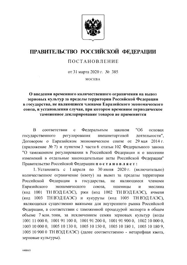 1. Установить с 1 апреля по 30 июня 2020 г. (включительно) количественное ограничение (квоту) на вывоз за пределы территории Российской Федерации в государства, не являющиеся членами Евразийского экономического союза, пшеницы и меслина (код 1001 ТН ВЭД ЕАЭС), ржи (код 1002 ТН ВЭД ЕАЭС), ячменя (код 1003 ТН ВЭД ЕАЭС) и кукурузы (код 1005 ТН ВЭД ЕАЭС), являющихся существенно важными для внутреннего рынка Российской Федерации, в соответствии с таможенной процедурой экспорта в общем объеме 7 млн. тонн, за исключением семян зерновых культур (коды 1001 11 000 0, 1001 91 100 0, 1001 91 200 0, 1001 91 900 0, 1002 10 000 0, 1003 10 000 0, 1005 10 130 0, 1005 10 150 0, 1005 10 180 1, 1005 10 180 9, 1005 10 900 0 ТН ВЭД ЕАЭС) (далее соответственно - нетарифная квота, зерновые культуры).