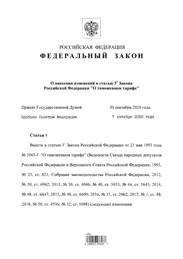 Президент подписал Федеральный закон «О внесении изменений в статью З1 Закона Российской Федерации «О таможенном тарифе».