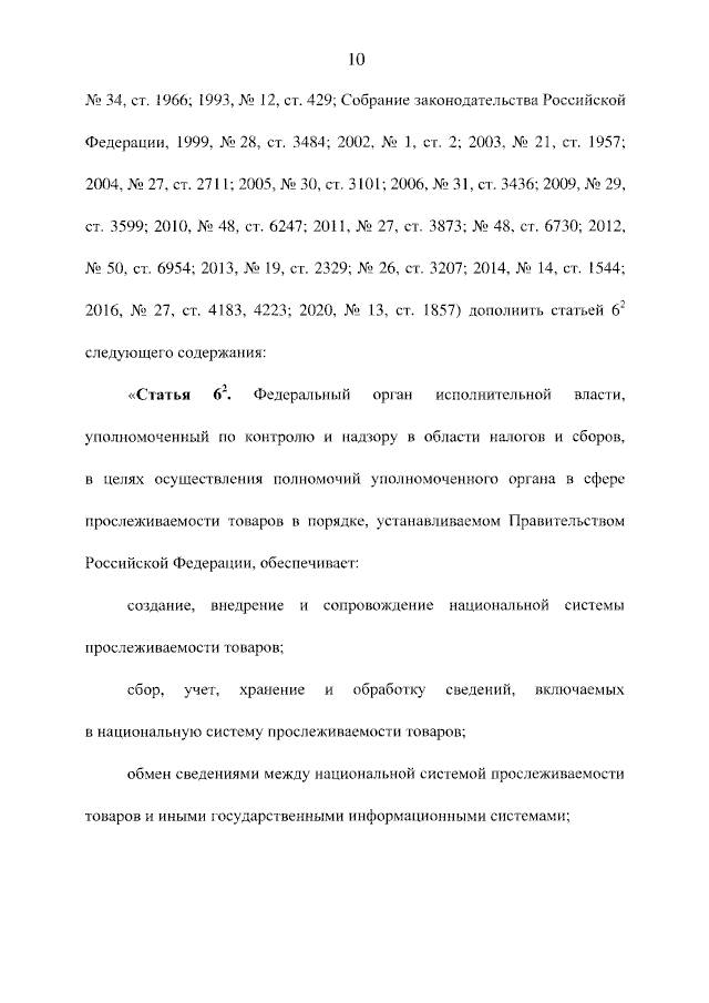 "Статья 62. Федеральный орган исполнительной власти, уполномоченный по контролю и надзору в области налогов и сборов, в целях осуществления полномочий уполномоченного органа в сфере прослеживаемости товаров в порядке, устанавливаемом Правительством Российской Федерации, обеспечивает: