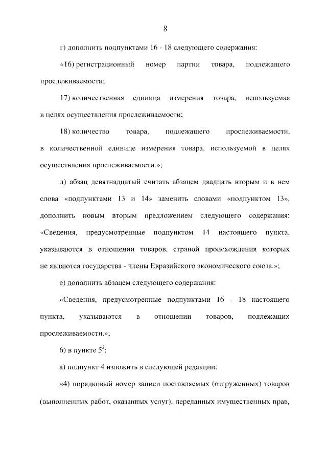 д) абзац девятнадцатый считать абзацем двадцать вторым и в нем слова "подпунктами 13 и 14" заменить словами "подпунктом 13", дополнить новым вторым предложением следующего содержания: "Сведения, предусмотренные подпунктом 14 настоящего пункта, указываются в отношении товаров, страной происхождения которых не являются государства - члены Евразийского экономического союза.";