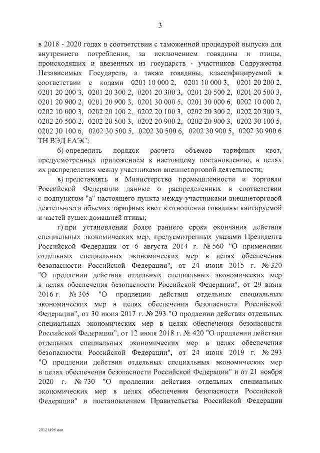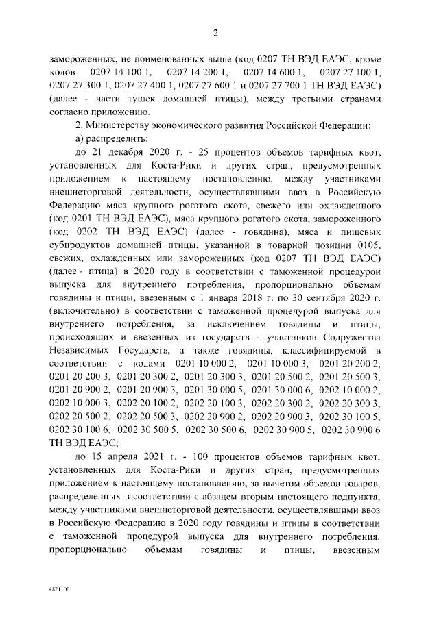 до 15 апреля 2021 г. - 100 процентов объемов тарифных квот, установленных для Коста-Рики и других стран, предусмотренных приложением к настоящему постановлению, за вычетом объемов товаров, распределенных в соответствии с абзацем вторым настоящего подпункта, между участниками внешнеторговой деятельности, осуществлявшими ввоз в Российскую Федерацию в 2020 году говядины и птицы в соответствии с таможенной процедурой выпуска для внутреннего потребления, пропорционально объемам говядины и птицы, ввезенным в 2018 - 2020 годах в соответствии с таможенной процедурой выпуска для внутреннего потребления, за исключением говядины и птицы, происходящих и ввезенных из государств - участников Содружества Независимых Государств, а также говядины, классифицируемой в соответствии с кодами 0201 10 000 2, 0201 10 000 3, 0201 20 200 2, 0201 20 200 3, 0201 20 300 2, 0201 20 300 3, 0201 20 500 2, 0201 20 500 3, 0201 20 900 2, 0201 20 900 3, 0201 30 000 5, 0201 30 000 6, 0202 10 000 2, 0202 10 000 3, 0202 20 100 2, 0202 20 100 3, 0202 20 300 2, 0202 20 300 3, 0202 20 500 2, 0202 20 500 3, 0202 20 900 2, 0202 20 900 3, 0202 30 100 5, 0202 30 100 6, 0202 30 500 5, 0202 30 500 6, 0202 30 900 5, 0202 30 900 6 ТН ВЭД ЕАЭС;