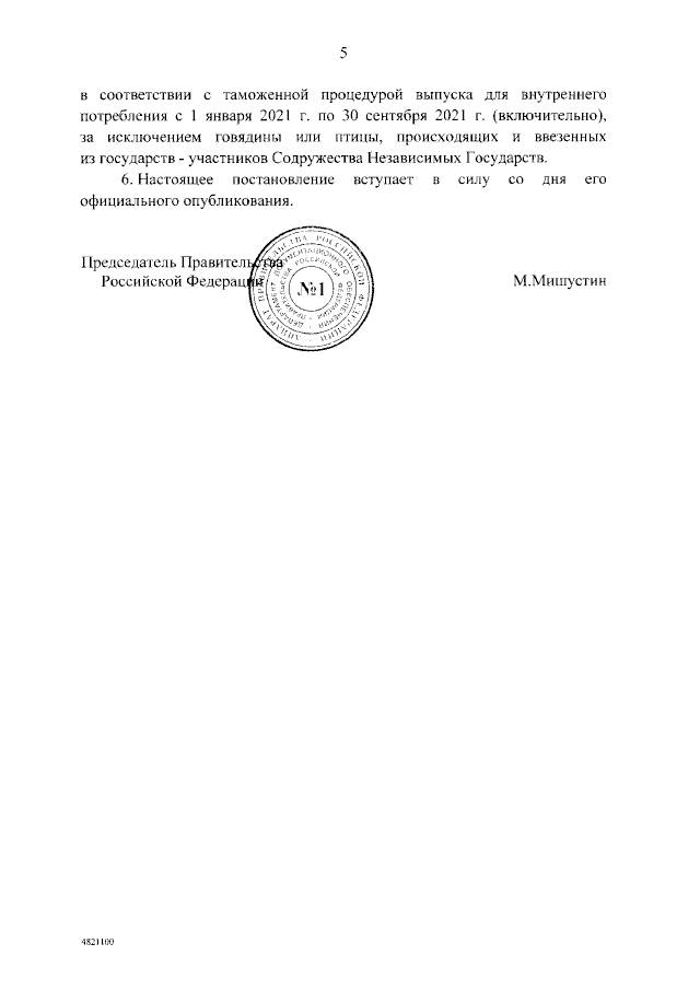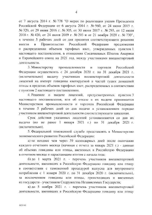 3. Министерству промышленности и торговли Российской Федерации осуществлять с 24 декабря 2020 г. по 31 декабря 2021 г. (включительно) выдачу участникам внешнеторговой деятельности лицензий на импорт говядины квотируемой и частей тушек домашней птицы в пределах объемов тарифных квот, распределенных в соответствии с пунктом 2 настоящего постановления.