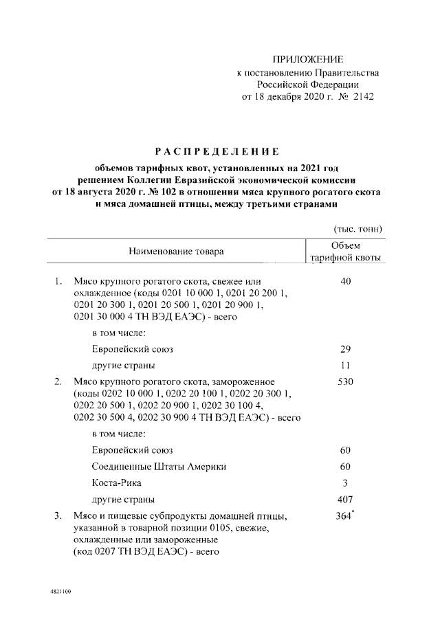 На официальном интернет-портале правовой информации 18 декабря 2020 года опубликовано Постановление Правительства Российской Федерации от 18.12.2020 № 2142 "О распределении объемов тарифных квот в отношении мяса крупного рогатого скота и мяса домашней птицы в 2021 году".