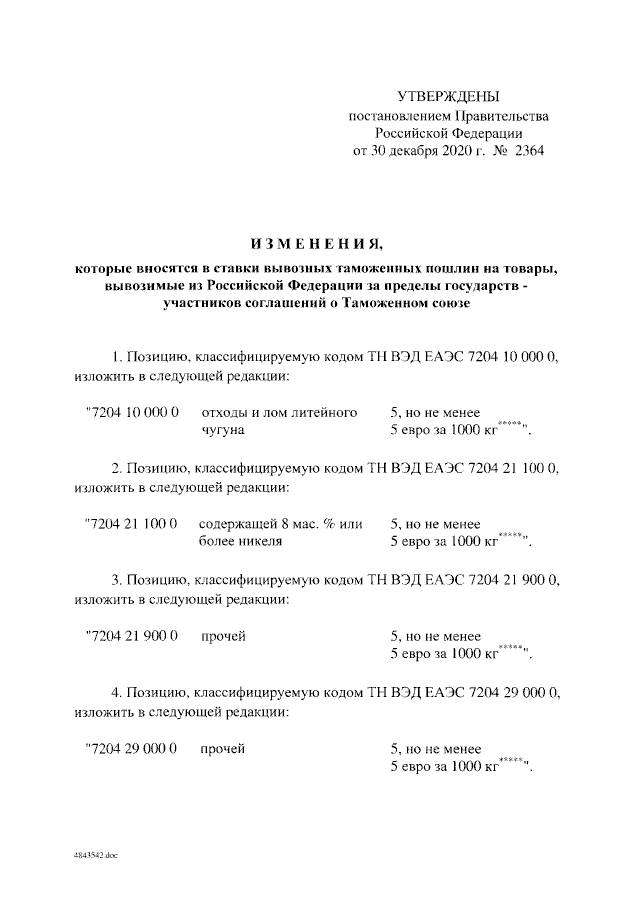На официальном интернет-портале правовой информации 31 декабря 2020 года опубликовано Постановление Правительства Российской Федерации от 30.12.2020 № 2364 "О внесении изменений в ставки вывозных таможенных пошлин на товары, вывозимые из Российской Федерации за пределы государств - участников соглашений о Таможенном союзе".