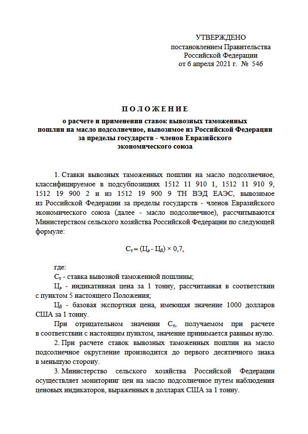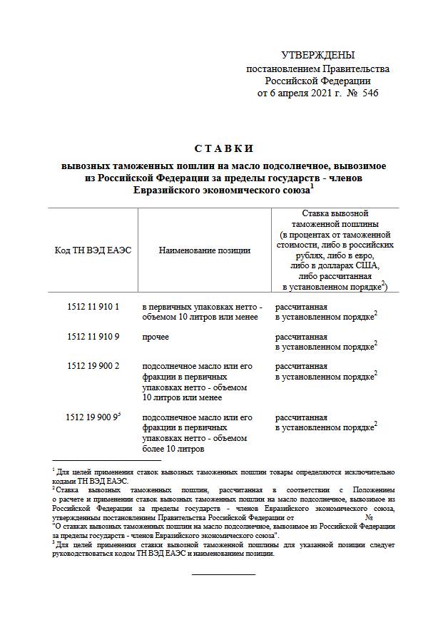 2 Ставка вывозных таможенных пошлин, рассчитанная в соответствии с Положением о расчете и применении ставок вывозных таможенных пошлин на масло подсолнечное, вывозимое из Российской Федерации за пределы государств - членов Евразийского экономического союза, утвержденным постановлением Правительства Российской Федерации от № "О ставках вывозных таможенных пошлин на масло подсолнечное, вывозимое из Российской Федерации за пределы государств - членов Евразийского экономического союза".