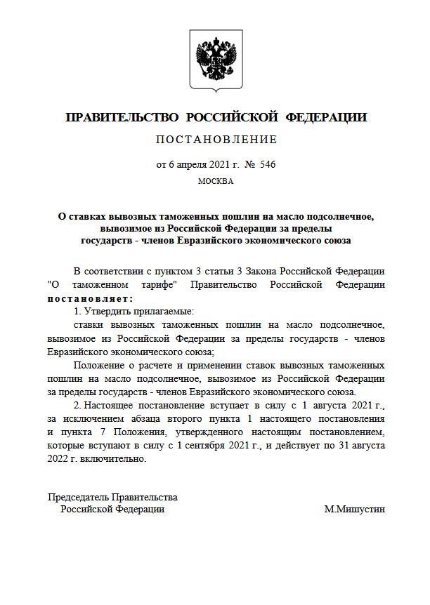 Постановление от 6 апреля 2021 года №546 опубликовано на сайте Правительства РФ 7 апреля.