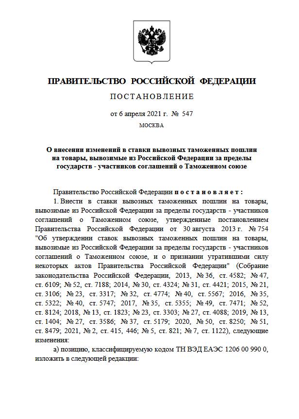 Постановление от 6 апреля 2021 года №547 опубликовано на сайте Правительства РФ 7 апреля.
