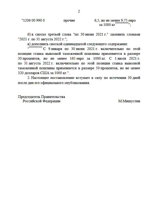 " С 9 января по 30 июня 2021 г. включительно по этой позиции ставка вывозной таможенной пошлины применяется в размере 30 процентов, но не менее 165 евро за 1000 кг. С 1 июля 2021 г. по 31 августа 2022 г. включительно по этой позиции ставка вывозной таможенной пошлины применяется в размере 50 процентов, но не менее 320 долларов США за 1000 кг.".
