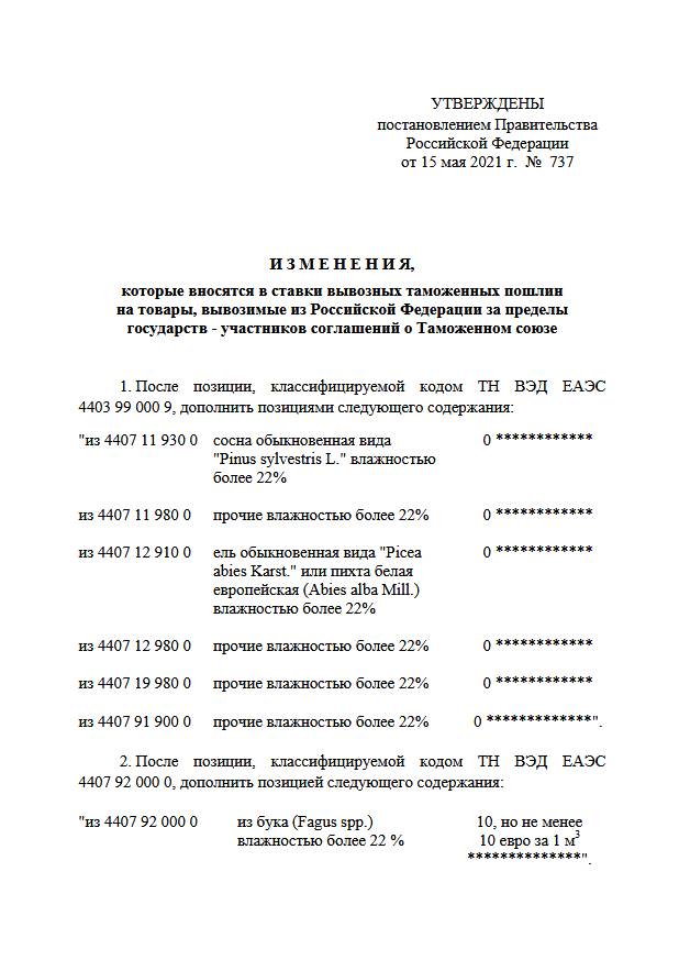 С 1 июля по 31 декабря 2021 г. включительно по этой позиции ставка вывозной таможенной пошлины применяется в размере 10 процентов, но не менее 50 евро за 1 м3.".