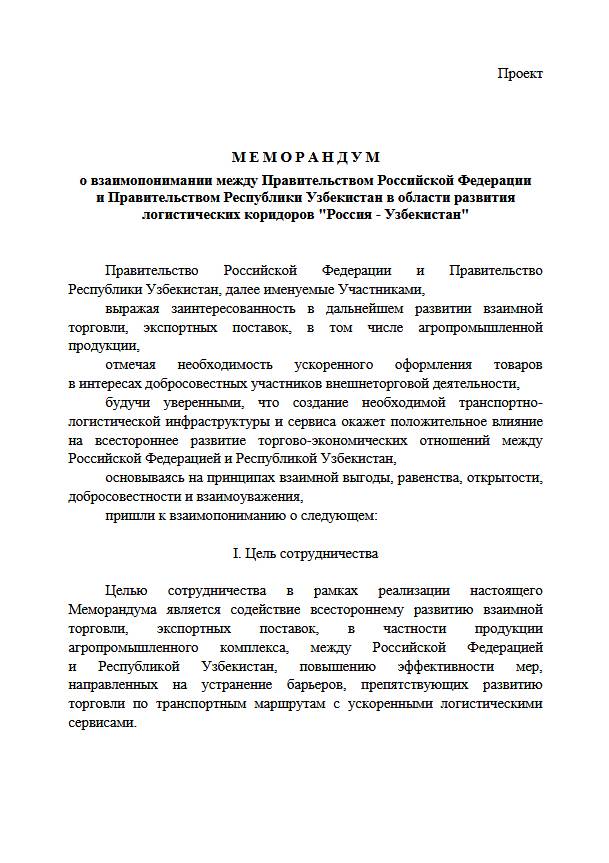 Целью сотрудничества в рамках реализации настоящего Меморандума является содействие всестороннему развитию взаимной торговли, экспортных поставок, в частности продукции агропромышленного комплекса, между Российской Федерацией и Республикой Узбекистан, повышению эффективности мер, направленных на устранение барьеров, препятствующих развитию торговли по транспортным маршрутам с ускоренными логистическими сервисами.