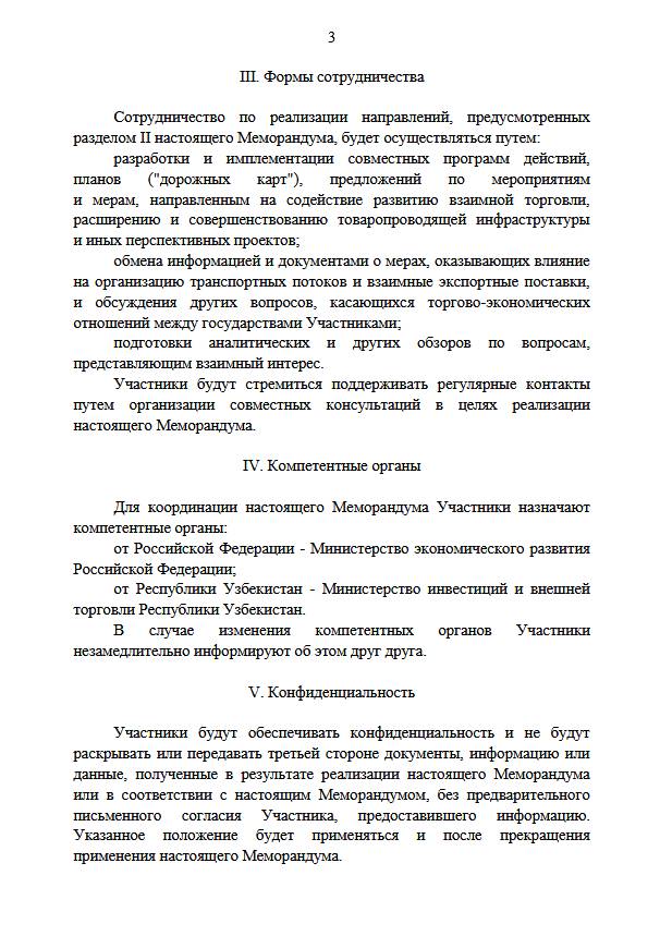 Координировать исполнение меморандума с российской стороны будет Минэкономразвития, с узбекистанской стороны – Министерство инвестиций и внешней торговли.