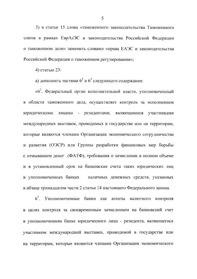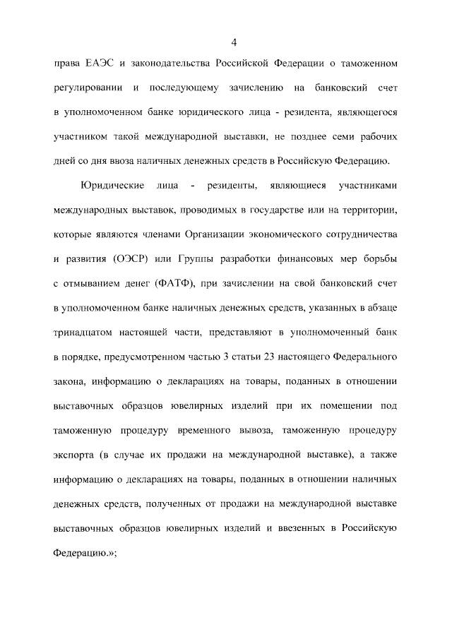 Юридические лица - резиденты, являющиеся участниками международных выставок, проводимых в государстве или на территории, которые являются членами Организации экономического сотрудничества и развития (ОЭСР) или Группы разработки финансовых мер борьбы с отмыванием денег (ФАТФ), при зачислении на свой банковский счет в уполномоченном банке наличных денежных средств, указанных в абзаце тринадцатом настоящей части, представляют в уполномоченный банк в порядке, предусмотренном частью 3 статьи 23 настоящего Федерального закона, информацию о декларациях на товары, поданных в отношении выставочных образцов ювелирных изделий при их помещении под таможенную процедуру временного вывоза, таможенную процедуру экспорта (в случае их продажи на международной выставке), а также информацию о декларациях на товары, поданных в отношении наличных денежных средств, полученных от продажи на международной выставке выставочных образцов ювелирных изделий и ввезенных в Российскую Федерацию.»;