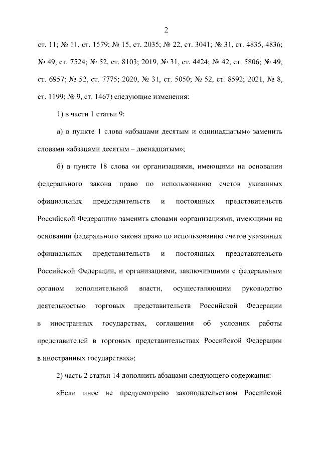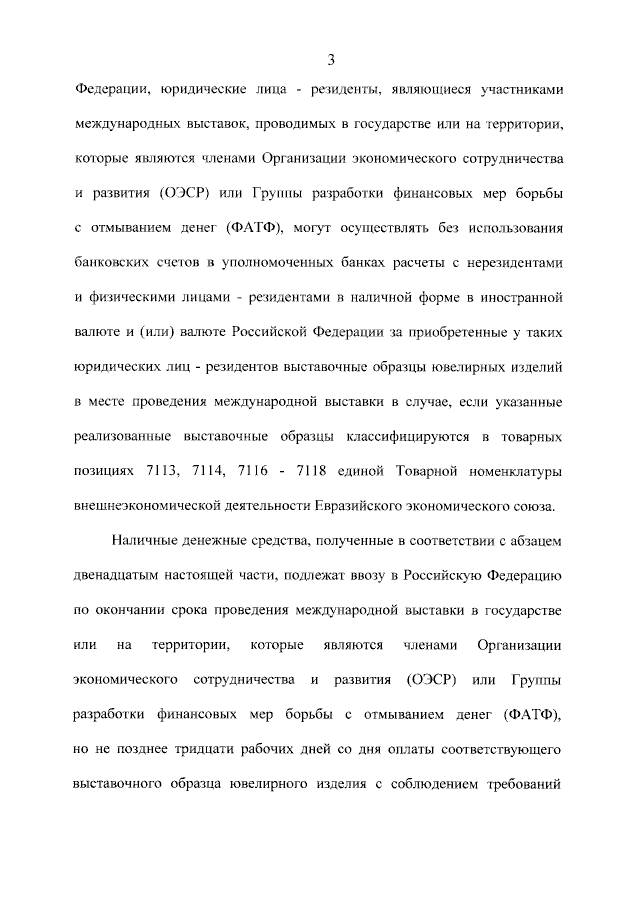 2) часть 2 статьи 14 дополнить абзацами следующего содержания: «Если иное не предусмотрено законодательством Российской Федерации, юридические лица - резиденты, являющиеся участниками международных выставок, проводимых в государстве или на территории, которые являются членами Организации экономического сотрудничества и развития (ОЭСР) или Группы разработки финансовых мер борьбы с отмыванием денег (ФАТФ), могут осуществлять без использования банковских счетов в уполномоченных банках расчеты с нерезидентами и физическими лицами - резидентами в наличной форме в иностранной валюте и (или) валюте Российской Федерации за приобретенные у таких юридических лиц - резидентов выставочные образцы ювелирных изделий в месте проведения международной выставки в случае, если указанные реализованные выставочные образцы классифицируются в товарных позициях 7113, 7114, 7116 - 7118 единой Товарной номенклатуры внешнеэкономической деятельности Евразийского экономического союза.