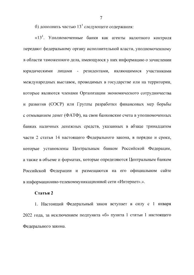 «131. Уполномоченные банки как агенты валютного контроля передают федеральному органу исполнительной власти, уполномоченному в области таможенного дела, имеющуюся у них информацию о зачислении юридическими лицами - резидентами, являющимися участниками международных выставок, проводимых в государстве или на территории, которые являются членами Организации экономического сотрудничества и развития (ОЭСР) или Группы разработки финансовых мер борьбы с отмыванием денег (ФАТФ), на свои банковские счета в уполномоченных банках наличных денежных средств, указанных в абзаце тринадцатом части 2 статьи 14 настоящего Федерального закона, в порядке и сроки, которые установлены Центральным банком Российской Федерации, а также в объеме и форматах, которые определяются Центральным банком Российской Федерации и размещаются на его официальном сайте в информационно-телекоммуникационной сети «Интернет».».