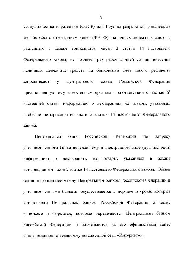 Центральный банк Российской Федерации по запросу уполномоченного банка передает ему в электронном виде (при наличии) информацию о декларациях на товары, указанных в абзаце четырнадцатом части 2 статьи 14 настоящего Федерального закона. Обмен такой информацией между Центральным банком Российской Федерации и уполномоченными банками осуществляется в порядке и сроки, которые установлены Центральным банком Российской Федерации, а также в объеме и форматах, которые определяются Центральным банком Российской Федерации и размещаются на его официальном сайте в информационно-телекоммуникационной сети «Интернет».»;
