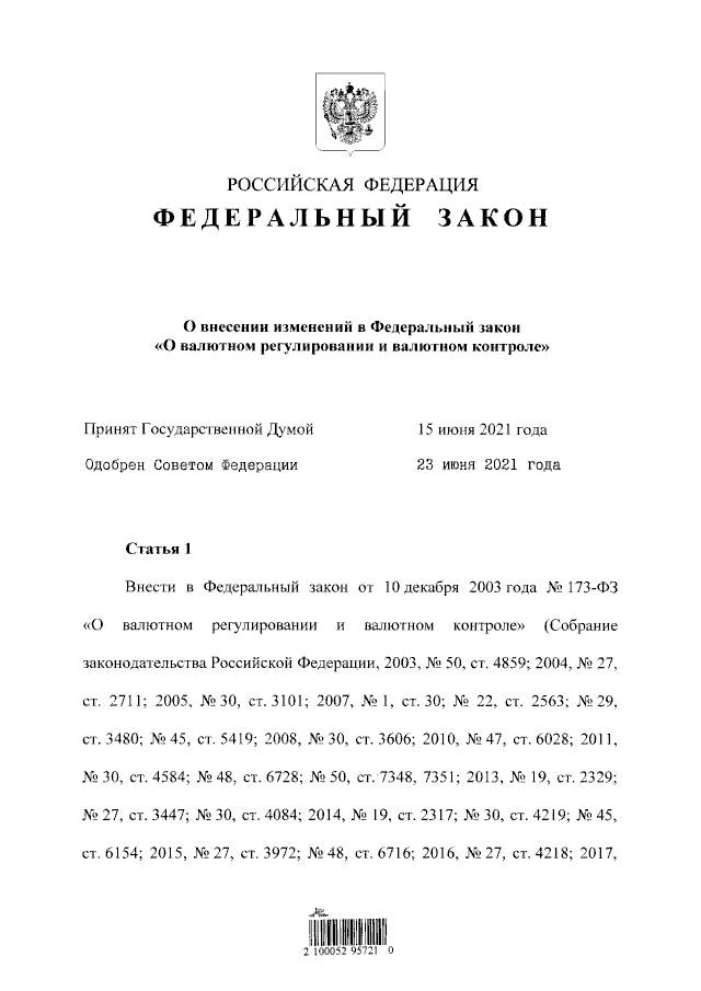 Федеральный закон от 28.06.2021 № 223-ФЗ "О внесении изменений в Федеральный закон "О валютном регулировании и валютном контроле" опубликован на официальном интернет-портале правовой информации 28 июня 2021 года.