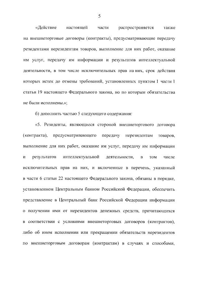 «5. Резиденты, являющиеся стороной внешнеторгового договора (контракта), предусматривающего передачу нерезидентам товаров, выполнение для них работ, оказание им услуг, передачу им информации и результатов интеллектуальной деятельности, в том числе исключительных прав на них, и включенные в перечень, указанный в части 6 статьи 22 настоящего Федерального закона, обязаны в порядке, установленном Центральным банком Российской Федерации, обеспечить представление в Центральный банк Российской Федерации информации о получении ими от нерезидентов денежных средств, причитающихся в соответствии с условиями внешнеторговых договоров (контрактов), либо об ином исполнении или прекращении обязательств нерезидентов по внешнеторговым договорам (контрактам) в случаях и способами, резидентами, являющимися участниками бюджетного процесса на федеральном уровне, федеральными государственными бюджетными (автономными) учреждениями, федеральными государственными унитарными предприятиями, и нерезидентами.