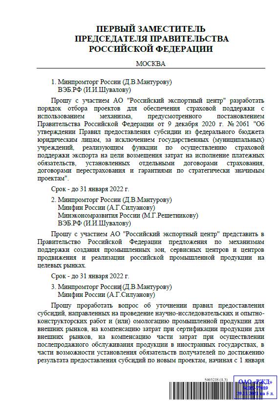 Первый заместитель председателя Правительства Российской Федерации Андрей Белоусов утвердил перечень поручений по созданию и совершенствованию мер поддержки экспорта. Документ АБ-П13-19618 подписан 28 декабря 2021 года.