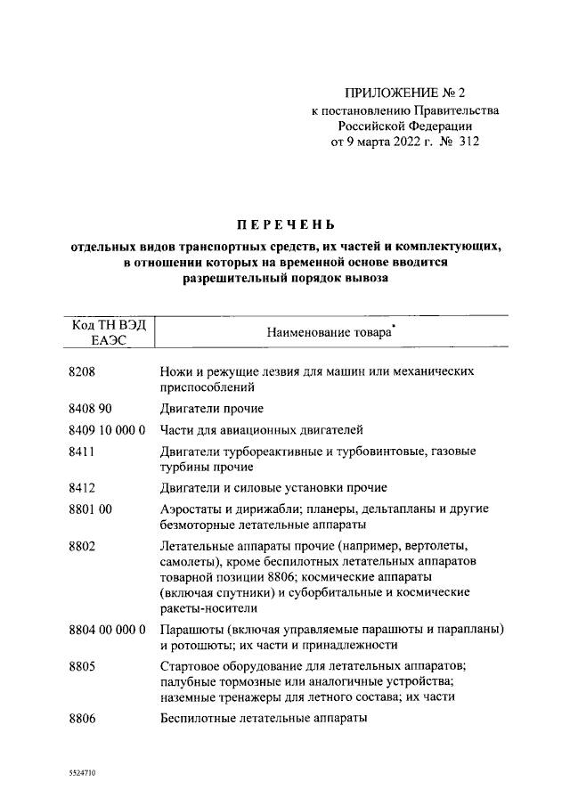 Приложение № 2 к постановлению Правительства Российской Федерации от 9 марта 2022 г. № 312