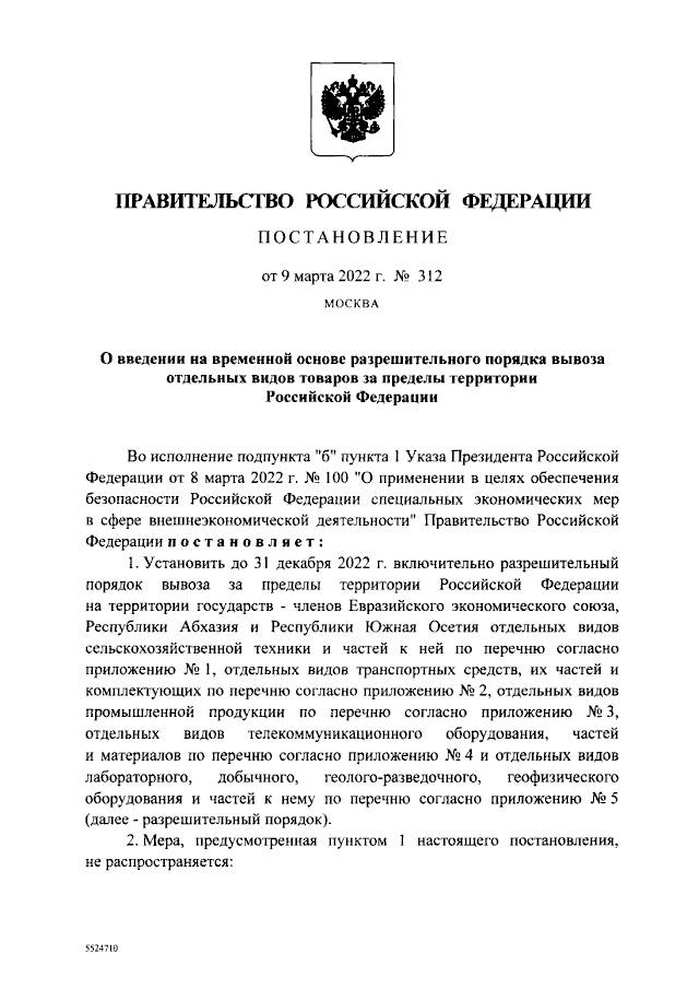 Постановление Правительства Российской Федерации от 09.03.2022 № 312 "О введении на временной основе разрешительного порядка вывоза отдельных видов товаров за пределы территории Российской Федерации" опубликовано на сайте Правительства РФ и официальном интернет-портале правовой информации.
