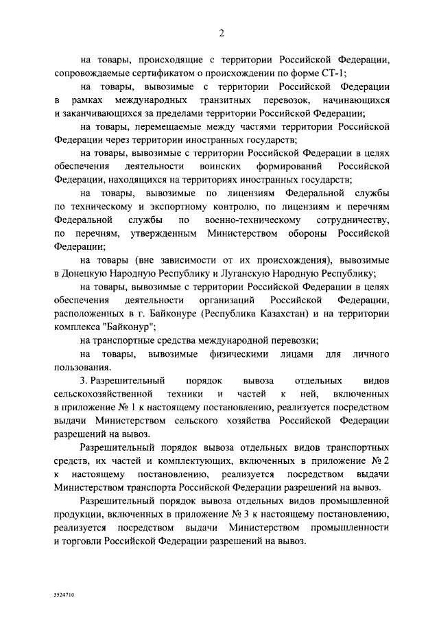 Разрешительный порядок вывоза отдельных видов транспортных средств, их частей и комплектующих, включенных в приложение № 2 к настоящему постановлению, реализуется посредством выдачи Министерством транспорта Российской Федерации разрешений на вывоз.