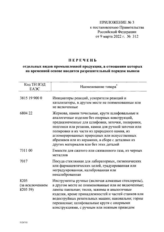Приложение № 3 к постановлению Правительства Российской Федерации от 9 марта 2022 г. № 312