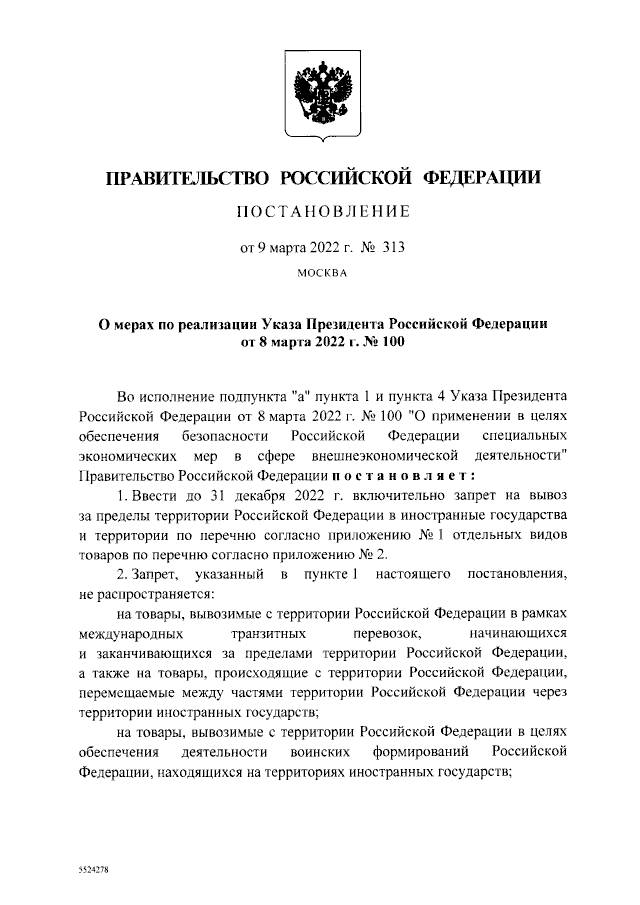 Постановление Правительства Российской Федерации от 09.03.2022 № 313 "О мерах по реализации Указа Президента Российской Федерации от 8 марта 2022 г. № 100" опубликовано на сайте Правительства РФ и официальном интернет-портале правовой информации.