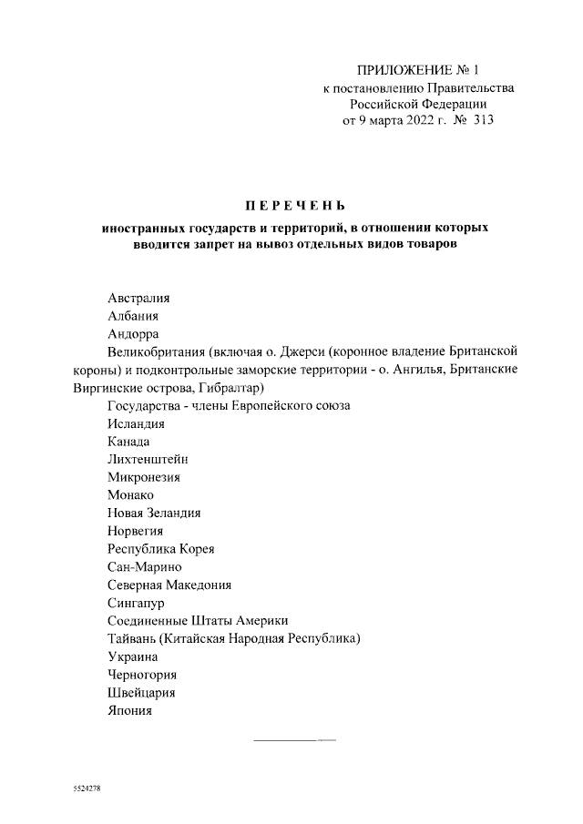 Приложение № 1 к постановлению Правительства Российской Федерации от 9 марта 2022 г. № 313