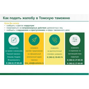 В Томскую таможню в прошедшем 2019 году и в истекшем периоде 2020 года жалобы граждан, участников внешнеэкономической деятельности на коррупционные действия должностных лиц не поступали. В Томской таможне всегда внимательно рассматриваются все звонки на «телефон доверия», жалобы, обращения граждан...
